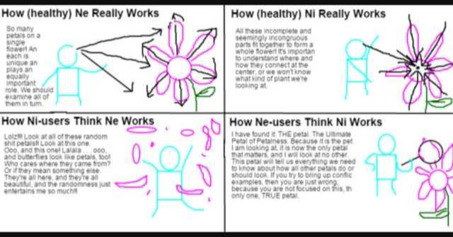 Ne는 어떤 가능성을 보고 그 가능성을 발산시키는 기능이다. entp와 enfp의 주기능인데, 이 유형이 연구/예체능 분야에서 많은 이유가 Ne 때문일 것이다.